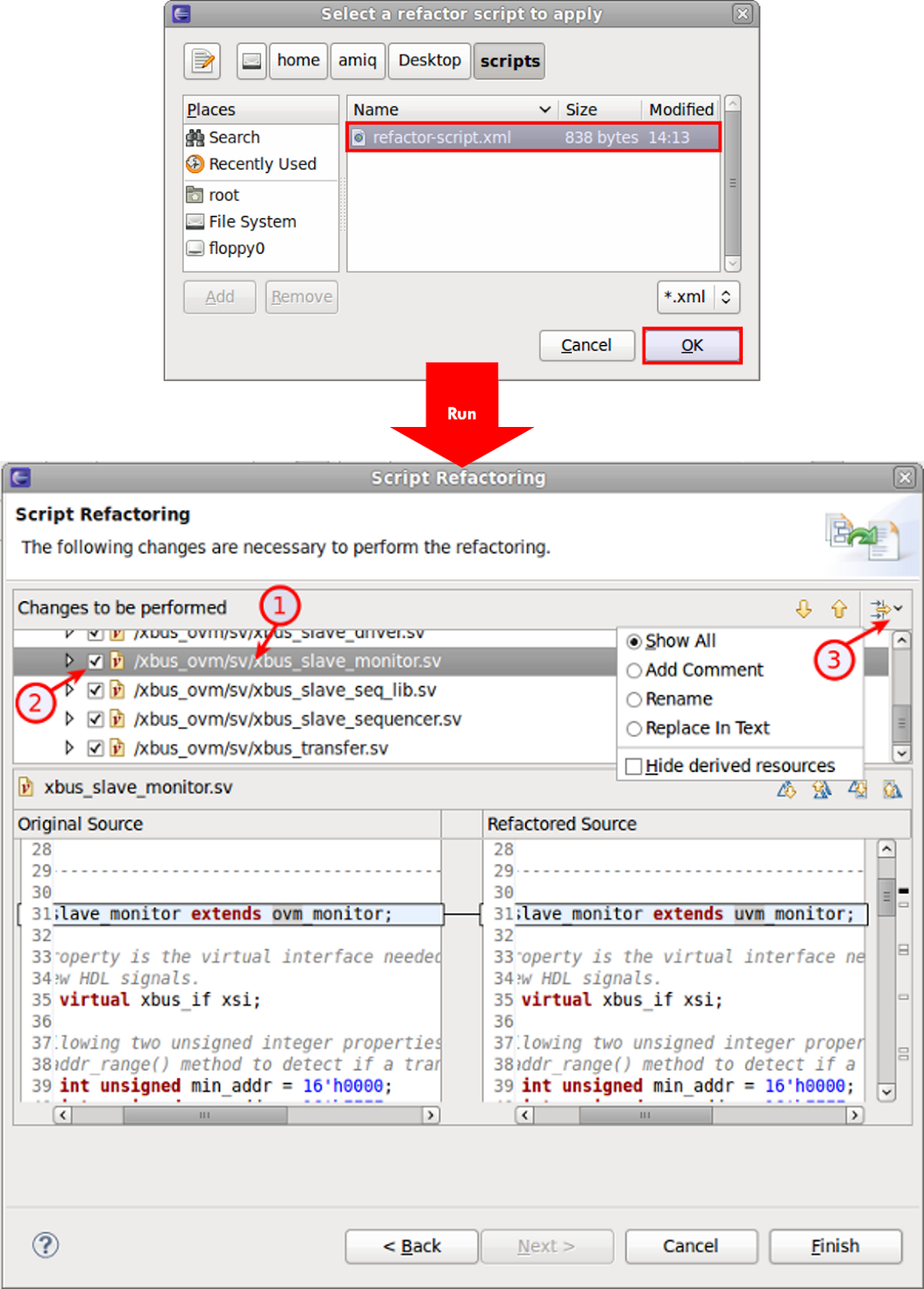 The IDE also supports refactoring scripts, which are XML files iterating changes to be performed on source code, scripts, or file/directory names. This automated process can run repeated operations on multiple files or at multiple times. Figure 9 shows selecting and running an XML script file. You can apply the changes immediately or inspect them one by one to be applied or skipped (bubbles 1 and 2). You can also filter the changes by refactoring type (bubble 3).