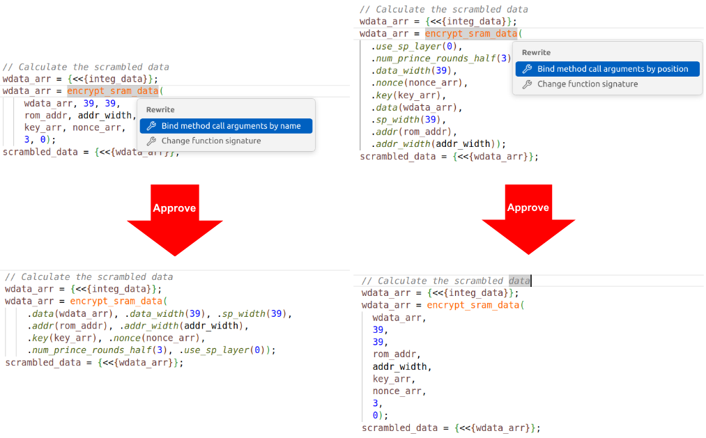 For example, Verilog and SystemVerilog let you specify module instance port connections and function call arguments by position or by name. The positional syntax is more concise, but can be confusing without explicit connections. The named syntax improves readability and it is not sensitive to argument or ports order, but it requires more typing. You might prefer to pick one style and stick with it, but conformance to your project coding guidelines may require conversion. Figure 5 shows the IDE automatically converting between the two styles.