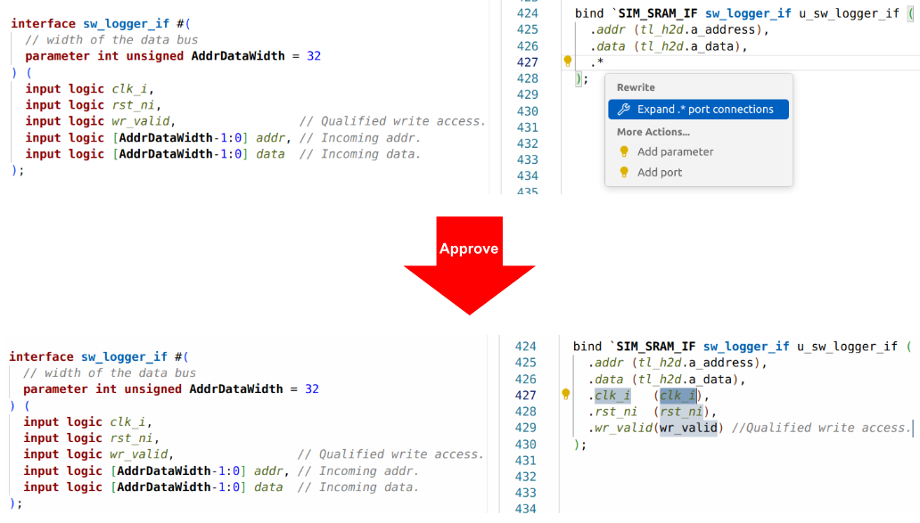 Being able to switch to named arguments with one click is very useful when reviewing or debugging code, since the connections are visible and you can easily see errors by inspection. A similar refactoring involves the SystemVerilog .* construct, which implicitly connects all ports to identically named signals. It’s very compact, but sometimes you might want to convert to a unified project coding style. Figure 6 shows the IDE performing this refactoring.