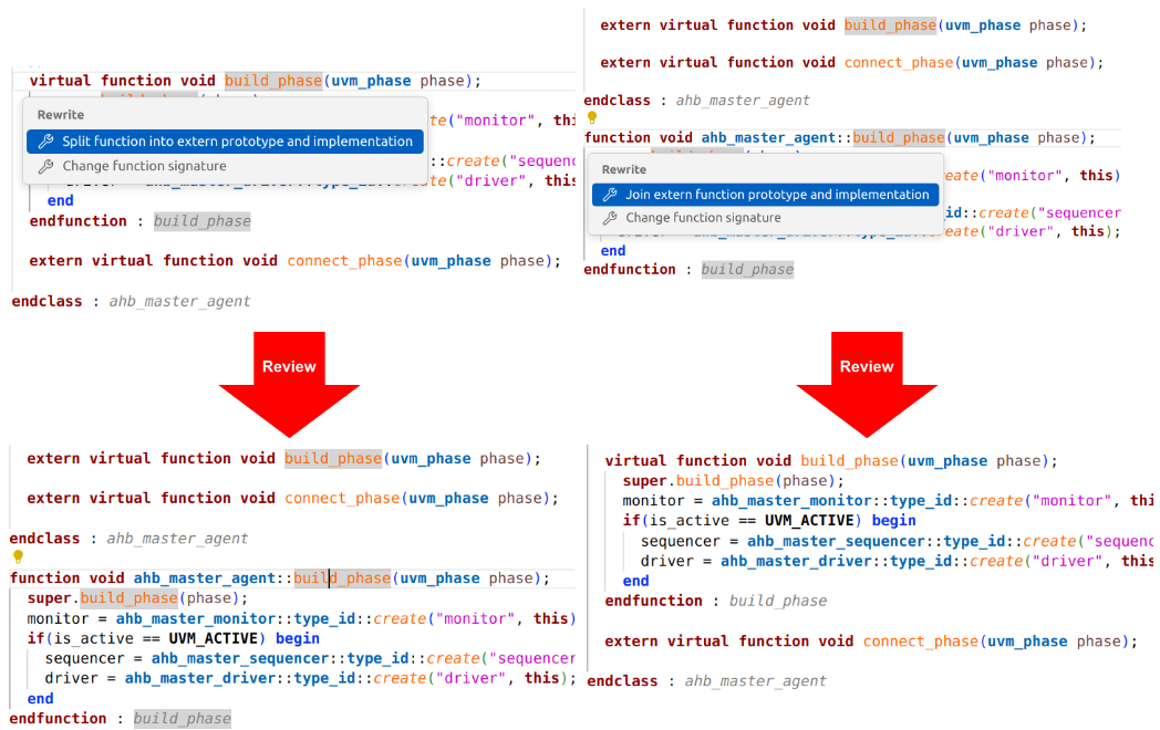 There are many cases in which you’d like to combine or split sections of code, sometimes to take advantage of SystemVerilog’s many options for flexibility. For example, you can implement a class method within the class itself or prototype it with an out-of-block implementation. The IDE can automatically reorganize the code to convert back and forth between these two options. Figure 4 shows an internal implementation split out as external and an external method implementation folded into the class. You might need to change from one to the other to make a particular verification element conform to project coding guidelines.
